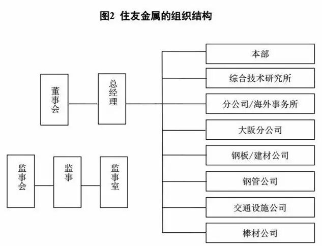 住友金属成立于1949年7月1日,本部位于大阪府大阪市中央区,其业务内容主要包括钢铁、新材料、土木建筑工程、电子零部件、电力供应、系统集成六大部分。2011财年,其粗钢产量为1272万吨,销售额为14733亿日元,拥有员工23007人。住友金属的组织结构见图2。