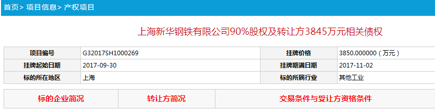 目前,宝钢发展有限公司(中国宝武钢铁集团下属企业)控股的上海新华钢铁有限公司(简称新华钢铁)90%股权及转让方3845万元相关债权在上海联交所挂牌出让,挂牌价格3850万元。
