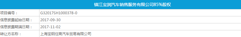 2017年9月30日,上海联合产权交易所公示了镇江宝润汽车销售服务有限公司85%股权的转让情况,根据公示内容,上海宝钢住商汽车贸易有限公司拟转让镇江宝润汽车销售服务有限公司85%股权。