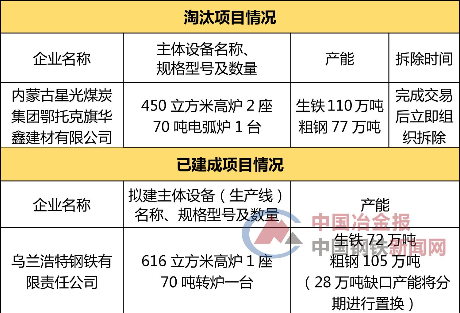 核心提示:近日,内蒙古经信委发布《关于乌兰浩特钢铁有限责任公司违规续建项目产能置换方案的公示》(以下简称“《公示》”),《公示》称,乌兰浩特钢铁有限责任公司(以下简称“乌钢”)与内蒙古星光煤炭集团鄂托克旗华鑫建材有限公司(以下简称“华鑫建材”)协商,达成购买华鑫建材110万吨生铁、77万吨粗钢产能协议。
